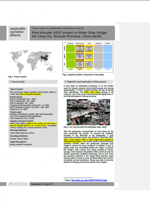 Wang, S. (2011) Post disaster UDDT project in Water Drop Village De Yang City, Sichuan Province, China (draft) Case study of sustainable sanitation projects