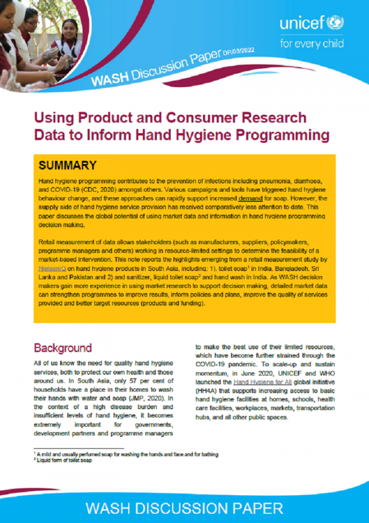 This document aims to be a guide, and a starting point for hand hygiene market assessments for ROSA Country Offices. The information here is based on previous UNICEF market assessments, market mapping toolkits, technical briefs, and field note learnings listed in the footnotes and the reference section.