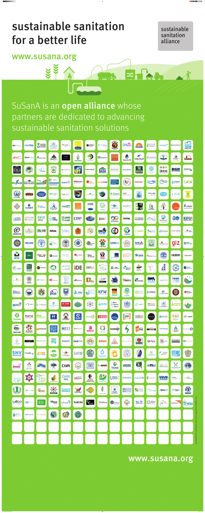 Two roll-ups were designed: 1. The SuSanA roll-up shows information regarding working groups, regional chapters, knowledge hub, and discussion forum 2. The SuSanA partner roll-up shows all SuSanA partner logos as of February 2019 The format of the roll-ups is 85x200 cm (with extra 15cm in the green at the bottom for printing purposes). The roll-ups include a 3mm bleed. Version 02.2019