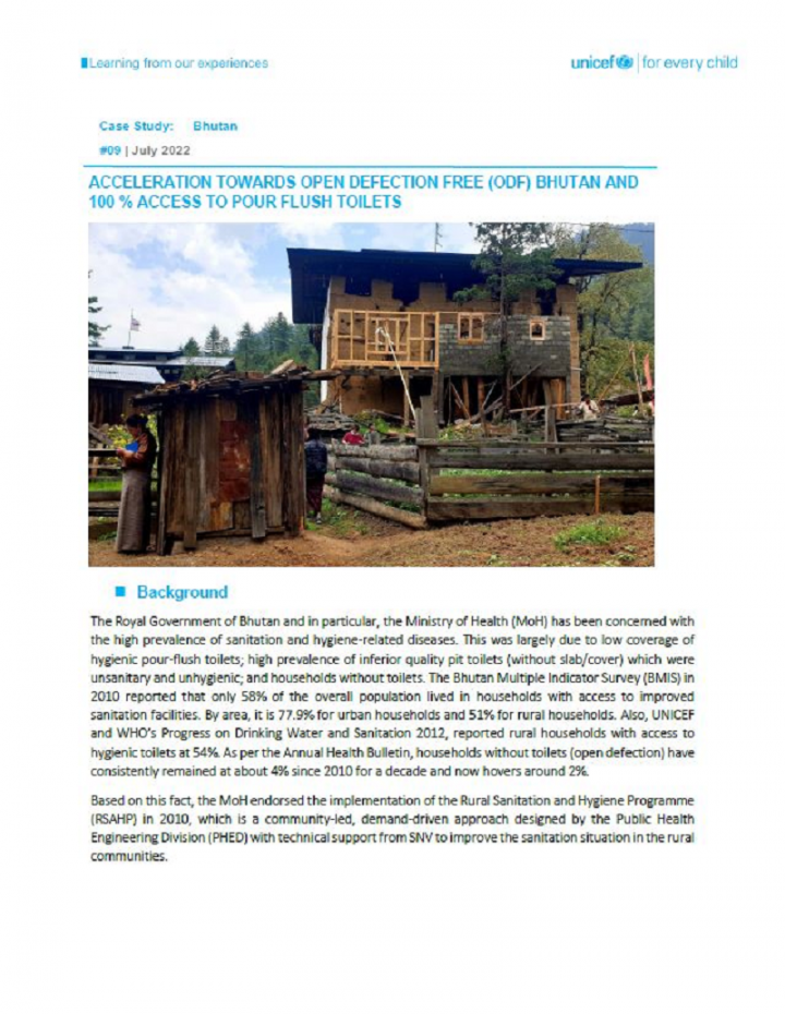 The Royal Government of Bhutan and in particular, the Ministry of Health (MoH) has been concerned with the high prevalence of sanitation and hygiene-related diseases. This was largely due to low coverage of hygienic pour-flush toilets; high prevalence of inferior quality pit toilets (without slab/cover) which were unsanitary and unhygienic; and households without toilets. The Bhutan Multiple Indicator Survey (BMIS) in 2010 reported that only […]