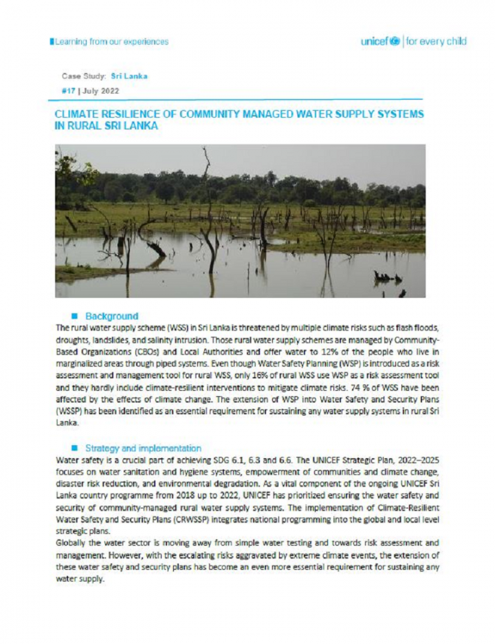 The rural water supply scheme (WSS) in Sri Lanka is threatened by multiple climate risks such as flash floods, droughts, landslides, and salinity intrusion. Those rural water supply schemes are managed by Community-Based Organizations (CBOs) and Local Authorities and offer water to 12% of the people who live in marginalized areas through piped systems. Even though Water Safety Planning (WSP) is introduced as a risk […]