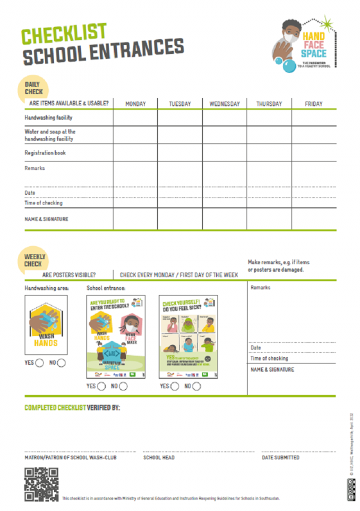 WASH in Schools Checklists to manage the spread of COVID-19 in schools. Checklist for 1) SCHOOL ENTRANCES, 2) CLASSROOMS, 3) TOILETS