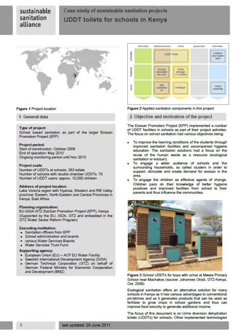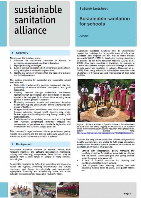 The aims of this factsheet are to: 1. Advocate for sustainable sanitation in schools in developing countries and countries in transition 2. Highlight existing challenges 3. Explore various innovations both in hardware and software using examples from developing countries. 4. Identify the common principles that are needed to achieve the desired outcomes. The guiding principles for successful and sustainable school sanitation are: · Stakeholder involvement in decision making and planning, […]