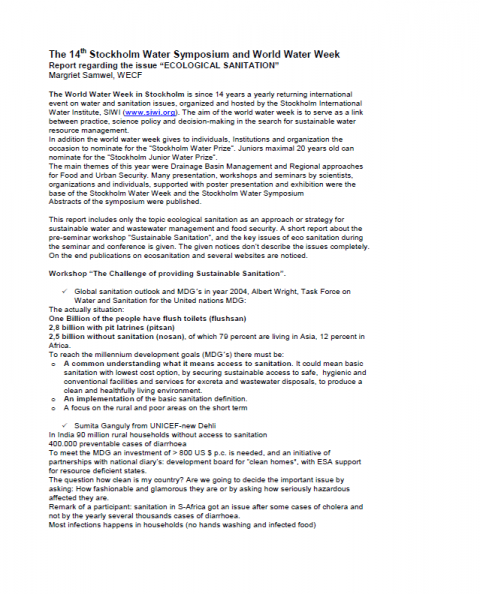Samwel, M. (2004) The 14th Stockholm Water Symposium and World Water Week Report regarding the issue “ECOLOGICAL SANITATION”