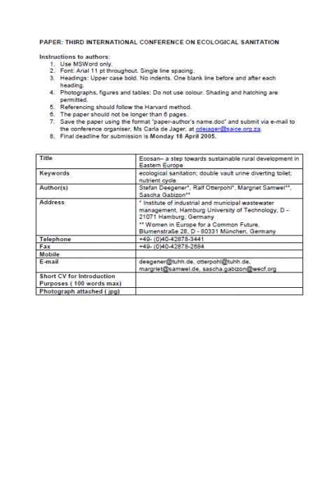 Samwel, M., Otterpohl, R., Deegener, S., Gabizon, S. (2005) Ecosan. A step towards sustainable rural development in Eastern Europe