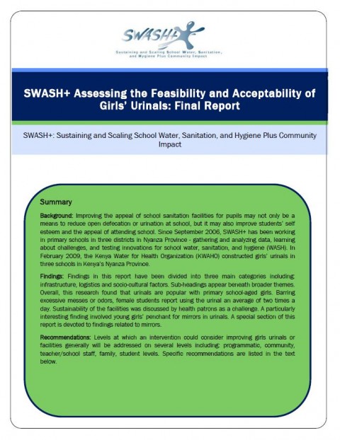 McMahon, S. (2009) SWASH+ Assessing the Feasibility and Acceptability of Girls’ Urinals: Final Report SWASH+: Sustaining and Scaling School Water, Sanitation, and Hygiene Plus Community Impact