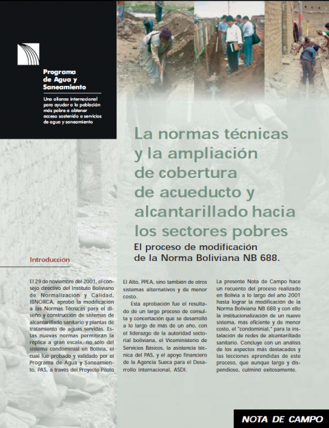 Arevalo-Correa, E. (2003) Las normas técnicas y la ampliación de cobertura de acueducto y alcantarillado hacia los sectores pobres (in Spanish) Technical standards and the growth of water supply and sewerage coverage to the poor - El proceso de modificación de la Norma Boliviana NB 688