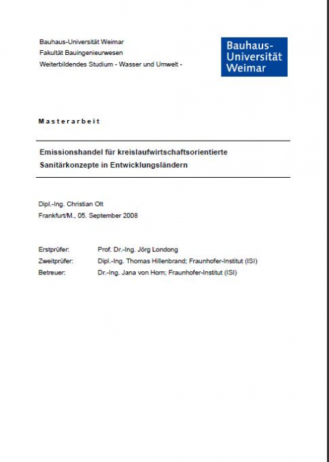 Olt, C. (2008) Emissionshandel für kreislaufwirtschaftsorientierte Sanitärsysteme in Entwicklungsländern (in German) Emissions trading for recycling-oriented sanitation systems in developing countries