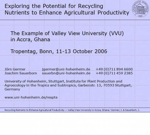 Germer, J.; Sauerborn, J. (2006) Exploring the Potential for Recycling Nutrients to Enhance Agricultural Productivity The Example of Valley View University (VVU) in Accra, Ghana