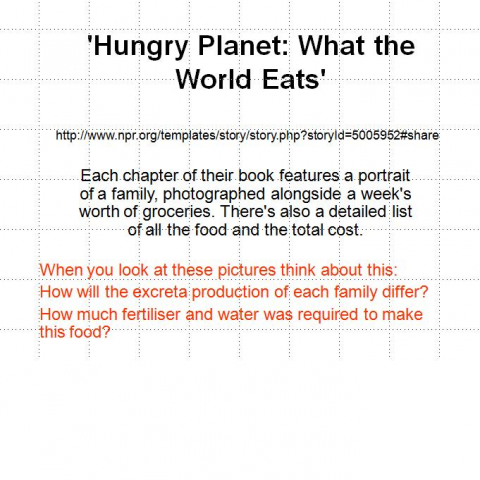 Menzel, P.; D'Aluisio, F. (2005) Hungry Planet What the World Eats