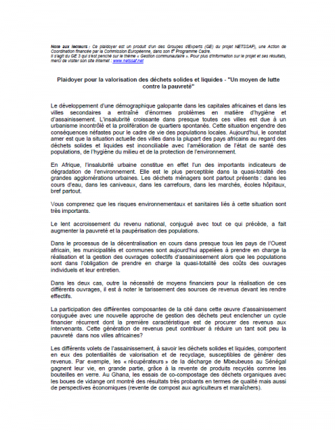Netssaf (2008) Plaidoyer pour la valorisation des déchets solides et liquides (in French) Advocacy for solid and liquid wastes recovery