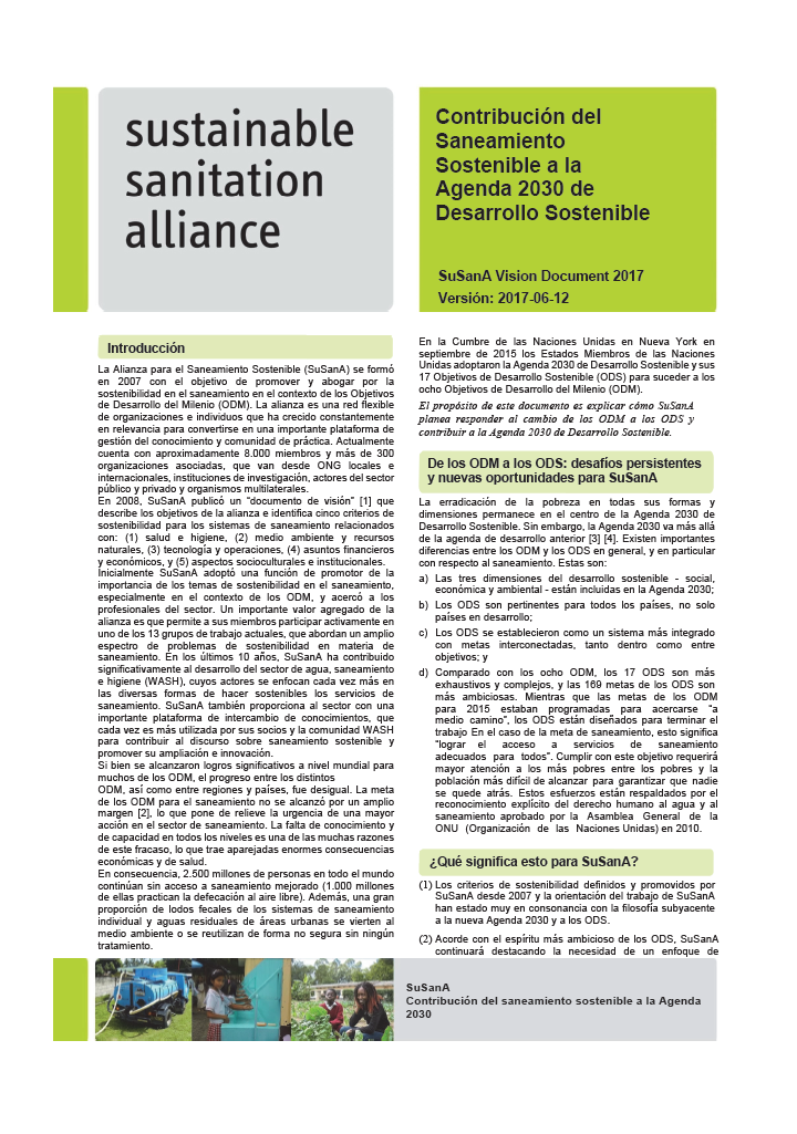 SuSanA (2017) Contribución del Saneamiento Sostenible a la Agenda 2030 de Desarrollo Sostenible (in Spanish) Contribution of Sustainable Sanitation to the Agenda 2030 for Sustainable Development - SuSanA Vision Document (Spanish version)