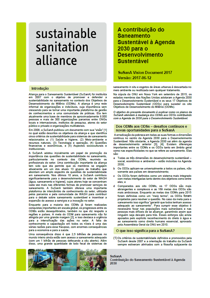 SuSanA (2017) A contribuição do Saneamento Sustentável à Agenda 2030 para o Desenvolvimento Sustentável (in Portuguese) Contribution of Sustainable Sanitation to the Agenda 2030 for Sustainable Development - SuSanA Vision Document (Portuguese version)