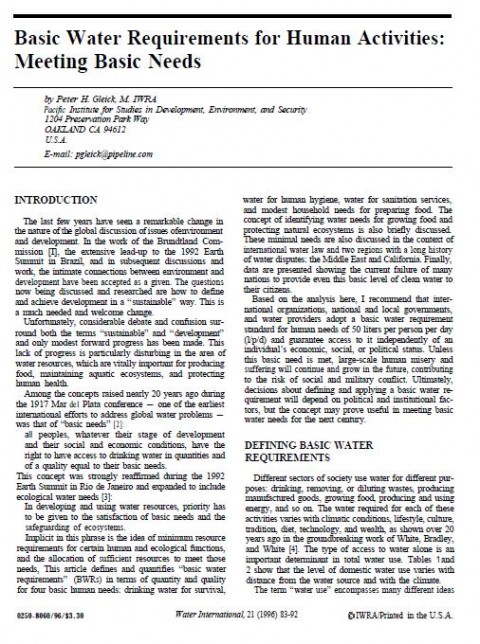 Gleick, P.H. (1996) Basic Water Requirements for Human Activities Meeting Basic Needs