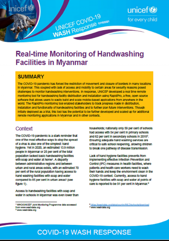 The COVID-19 pandemic has forced the restriction of movement and closure of borders in many locations in Myanmar. This coupled with lack of access and mobility to certain areas for security reasons posed challenges to monitor handwashing interventions. In response, UNICEF developed a real time remote monitoring tool for handwashing facility distribution and installation using RapidPro, a free, open source software that allows users to […]