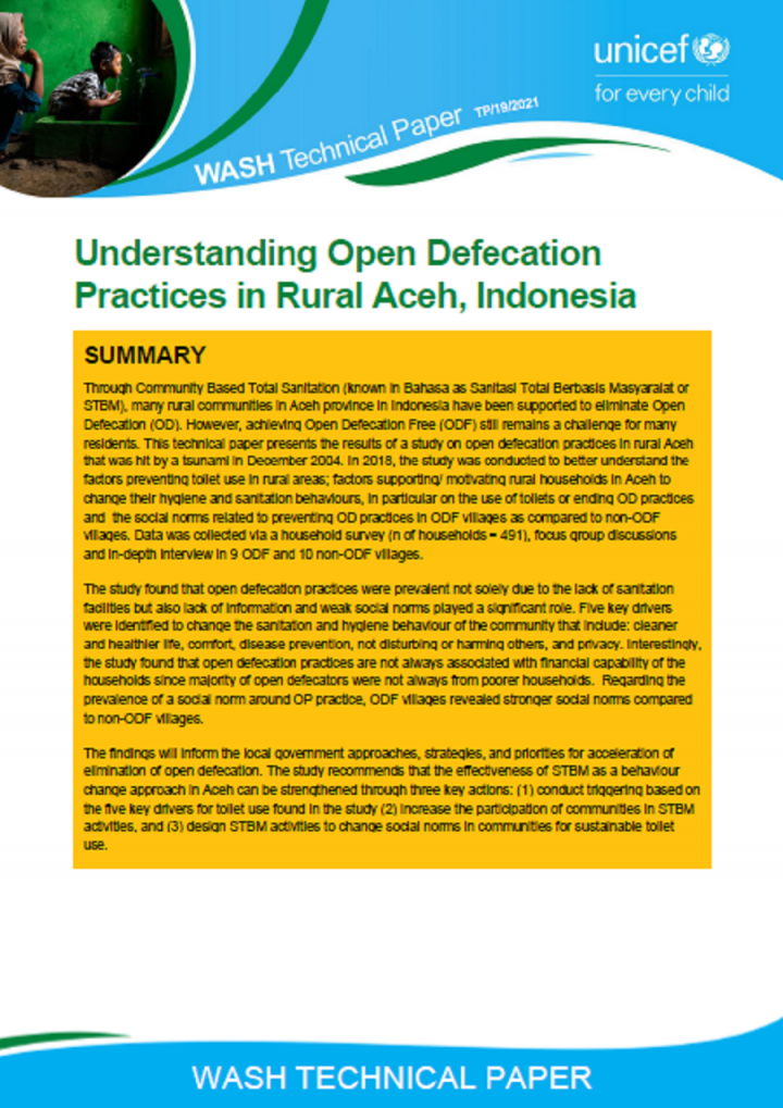 Through Community Based Total Sanitation (known in Bahasa as Sanitasi Total Berbasis Masyaralat or STBM), many rural communities in Aceh province in Indonesia have been supported to eliminate Open Defecation (OD). However, achieving Open Defecation Free (ODF) still remains a challenge for many residents. This technical paper presents the results of a study on open defecation practices in rural Aceh that was hit by a […]