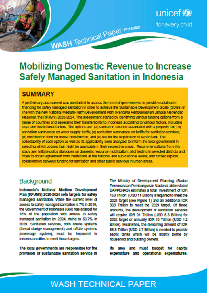 A preliminary assessment was conducted to assess the need of governments to provide sustainable financing for safely managed sanitation in order to achieve the Sustainable Development Goals (SDGs) in line with the new National Medium-Term Development Plan (Rencana Pembangunan Jangka Menengah Nasional, the RPJMN) 2020-2024. The assessment started by identifying various funding options from a range of countries and assessing their transferability to Indonesia according […]