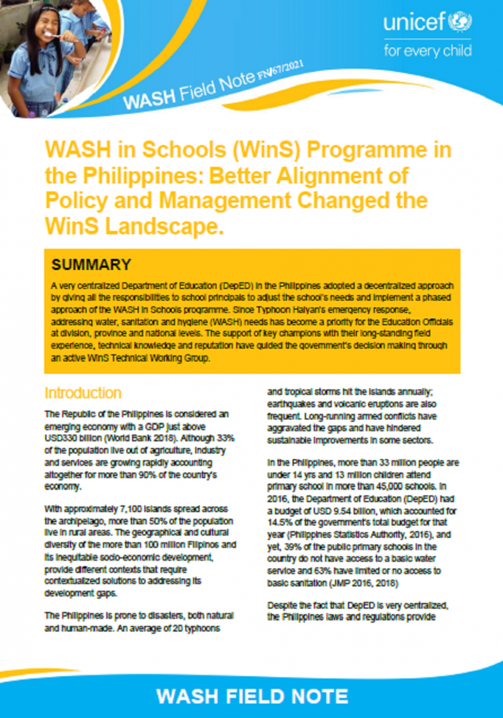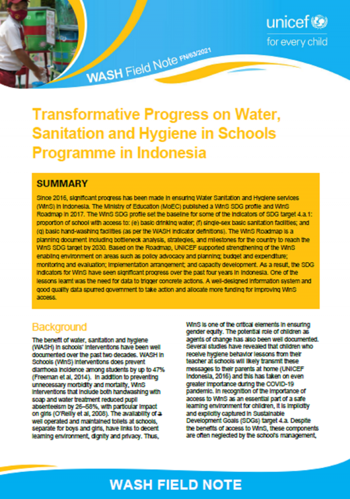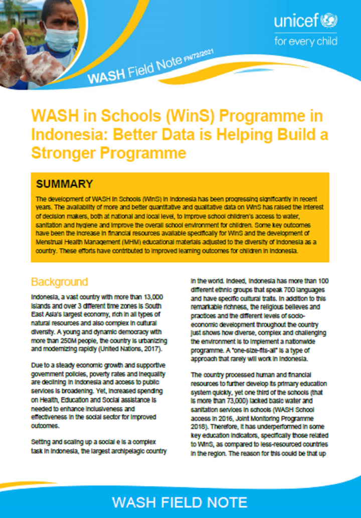 The development of WASH in Schools (WinS) in Indonesia has been progressing significantly in recent years. The availability of more and better quantitative and qualitative data on WinS has raised the interest of decision makers, both at national and local level, to improve school children’s access to water, sanitation and hygiene and improve the overall school environment for children. Some key outcomes have been the […]