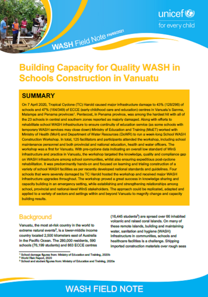 On 7 April 2020, Tropical Cyclone (TC) Harold caused major infrastructure damage to 43% (128/298) of schools and 47% (164/349) of ECCE (early childhood care and education) centres in Vanuatu’s Sanma, Malampa and Penama provinces1. Pentecost, in Penama province, was among the hardest hit with all of the 23 schools in central and southern zones reported as majorly damaged. Along with efforts to rehabilitate school WASH infrastructure to ensure […]