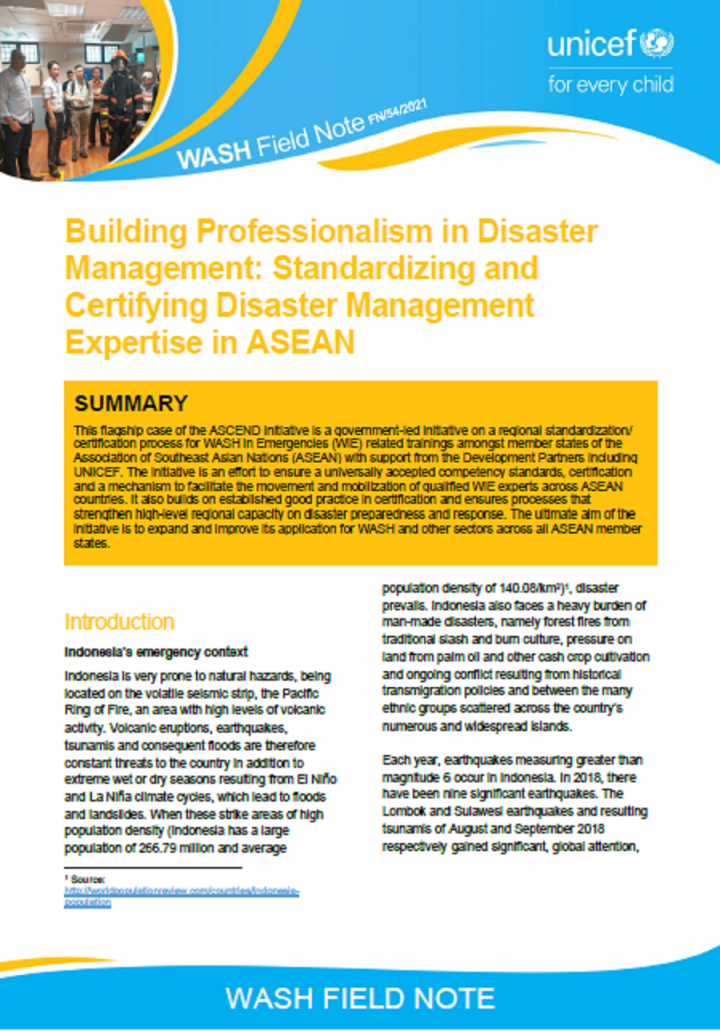 This flagship case of the ASCEND initiative is a government-led initiative on a regional standardization/ certification process for WASH in Emergencies (WiE) related trainings amongst member states of the Association of Southeast Asian Nations (ASEAN) with support from the Development Partners including UNICEF. The initiative is an effort to ensure a universally accepted competency standards, certification and a mechanism to facilitate the movement and mobilization […]