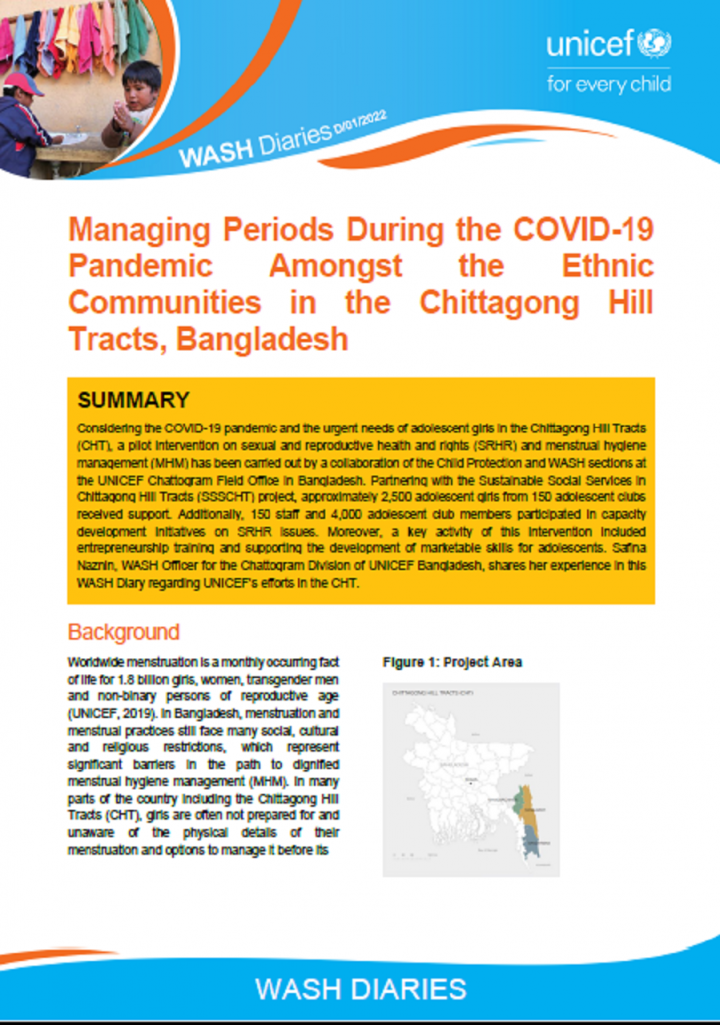 Considering the urgent needs of adolescent girls in the Chittagong Hill Tracts (CHT), a pilot intervention on sexual and reproductive health and rights (SRHR) and menstrual hygiene management (MHM) was carried out through the joint collaboration of the Child Protection and WASH sections at the UNICEF Chattogram Field Office in Bangladesh. Partnering with the Sustainable Social Services in Chittagong Hill Tracts (SSSCHT) project, approximately 2,500 […]