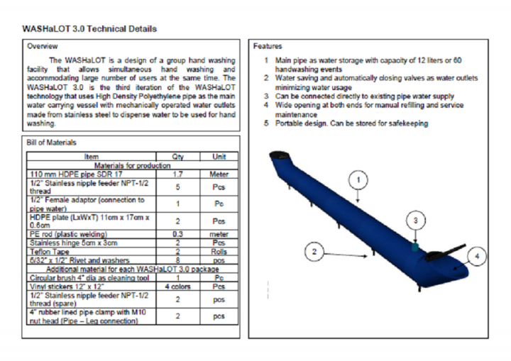 WASHaLOT 3.0 is a versatile design of a group handwashing facility that accommodates many users at the same time and a water-saving facility with automatically closing individual water outlets. To support the adaption of the WASHaLOT 3.0, documents are made available to the public to guide in the production process of the WASHaLOT 3.0.