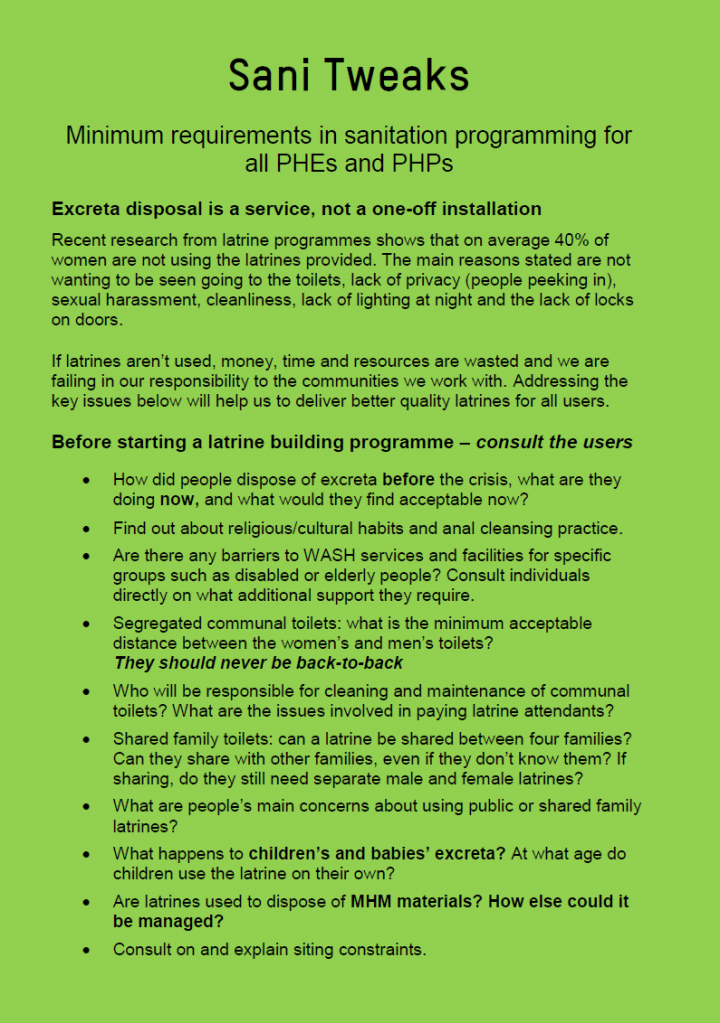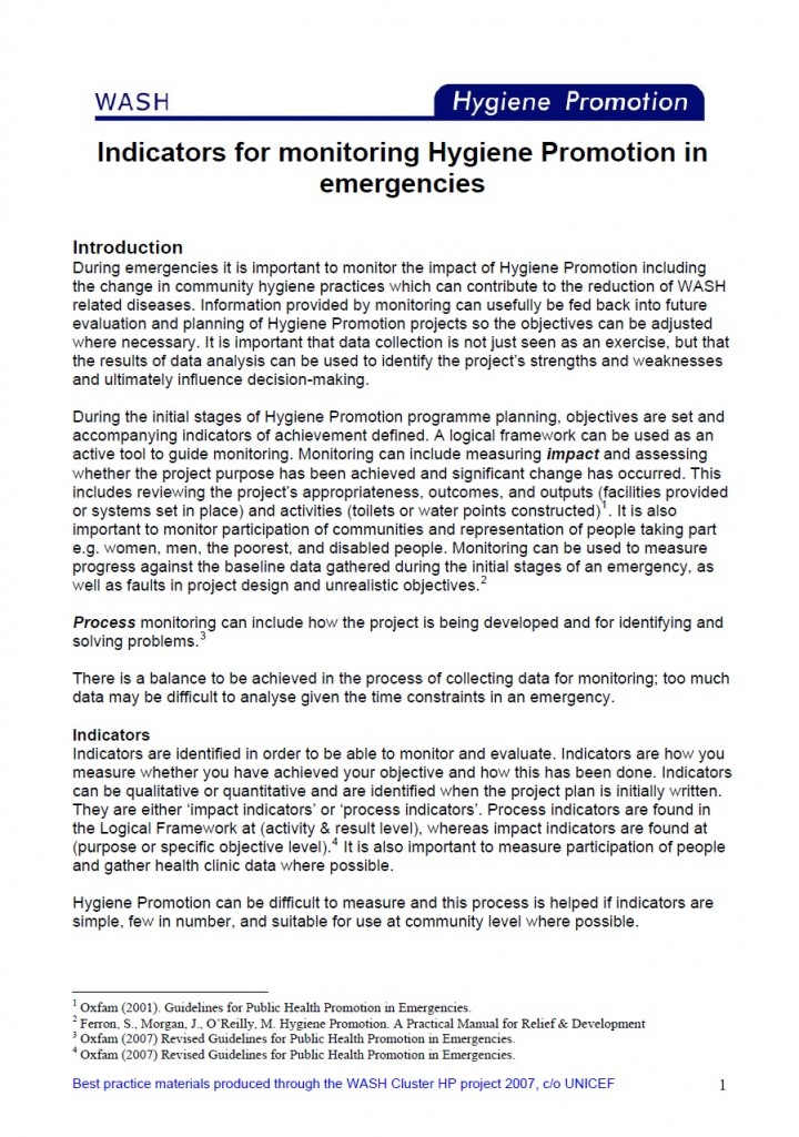 During emergencies it is important to monitor the impact of Hygiene Promotion including the change in community hygiene practices which can contribute to the reduction of WASH related diseases. Information provided by monitoring can usefully be fed back into future evaluation and planning of Hygiene Promotion projects so the objectives can be adjusted where necessary. It is important that data collection is not just seen […]