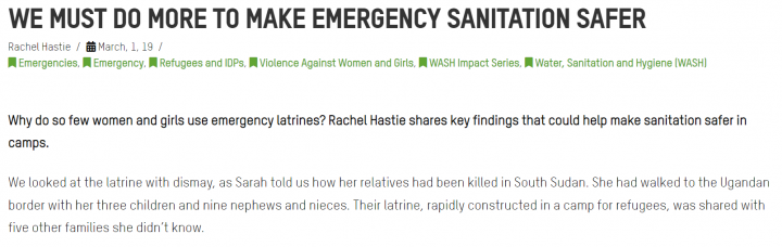 The rapid influx of Rohingya refugees into Cox's Bazar, Bangladesh, has led to the formation of huge camps, built on difficult terrain, short of space and with high population density. All these factors present numerous challenges to agencies seeking to provide latrines, water points, and bathing facilities. Feedback gathered from women and girls highlighted significant challenges around access, safety, privacy, and dignity, including management of […]