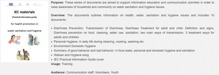 The documents outlines information on health, water, sanitation and hygiene issues and includes 10 documents: Diarrhoea Prevention, Transmission of Diarrhoea, Diarrhoea Treatment for adult and child: Definition and signs, Diarrhoea prevention on food, cleaning, water use, sanitation, two main ways of transmission, 3 treatment ways for adults and children Personal Hygiene: in daily life during cleaning, cooking, washing etc., Environment Domestic Hygiene, Summary of good behavior and […]