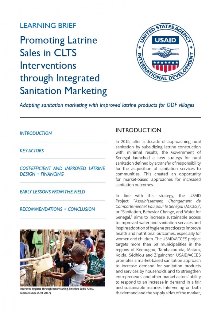 In 2015, after a decade of approaching rural sanitation by subsidizing latrine construction with minimal results, the Government of Senegal launched a new strategy for rural sanitation defined by a transfer of responsibility for the acquisition of sanitation services to communities. This created an opportunity for market-based approaches for increased sanitation outcomes. In line with this strategy, the USAID Project “Assainissement, Changement de Comportement et […]