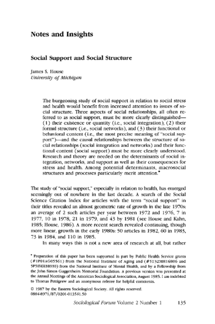 The burgeoning study of social support in relation to social stress and health would benefit from increased attention to issues of social structure. Three aspects of social relationships, all often referred to as social support, must be more clearly distinguished—(1) their existence or quantity (i.e., social integration), (2) their formal structure (i.e., social networks), and (3) their functional or behavioral content (i.e., the most precise […]
