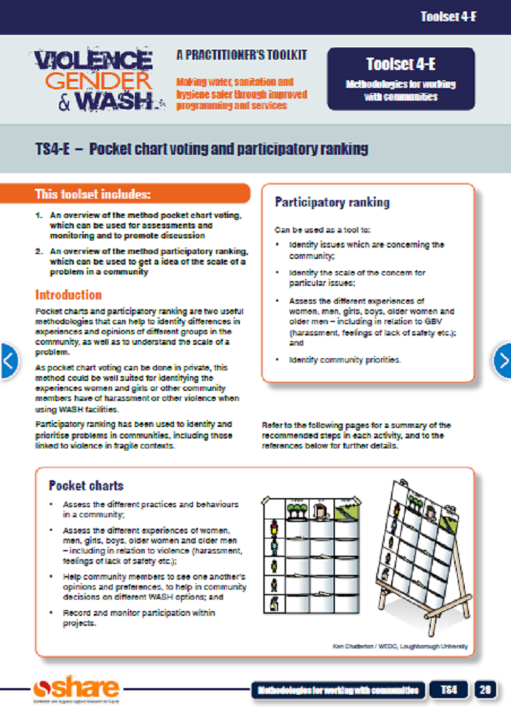 Pocket charts and participatory ranking are two useful methodologies that can help to identify differences in experiences and opinions of different groups in the community, as well as to understand the scale of a problem. As pocket chart voting can be done in private, this method could be well suited for identifying the experiences women and girls or other community members have of harassment or […]