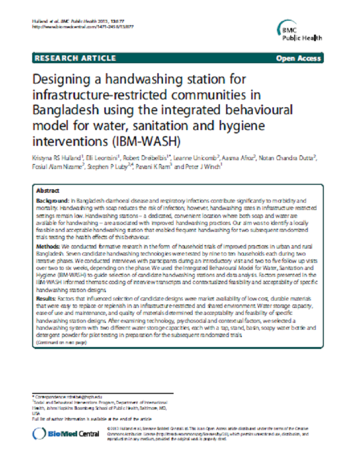 In Bangladesh diarrhoeal disease and respiratory infections contribute significantly to morbidity and mortality. Handwashing with soap reduces the risk of infection; however, handwashing rates in infrastructure-restricted settings remain low. Handwashing stations – a dedicated, convenient location where both soap and water are available for handwashing – are associated with improved handwashing practices. Our aim was to identify a locally feasible and acceptable handwashing station that […]