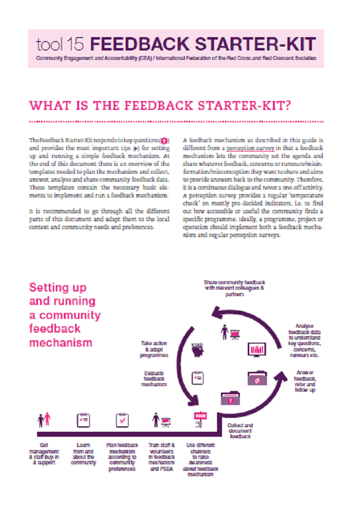 This feedback starter-kit responds to key questions and provides the most important tips for setting up and running a simple feedback mechanism. The kit includes an overview of templates containing the necessary basic elements to implement and run a feedback mechanism. All tools can be found under the 'related resources' section of this page.