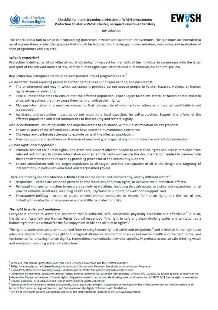 This checklist is a tool to assist in incorporating protection in water and sanitation interventions. The questions are intended to assist organizations in identifying issues that should be factored into the design, implementation, monitoring and evaluation of their programmes and projects.