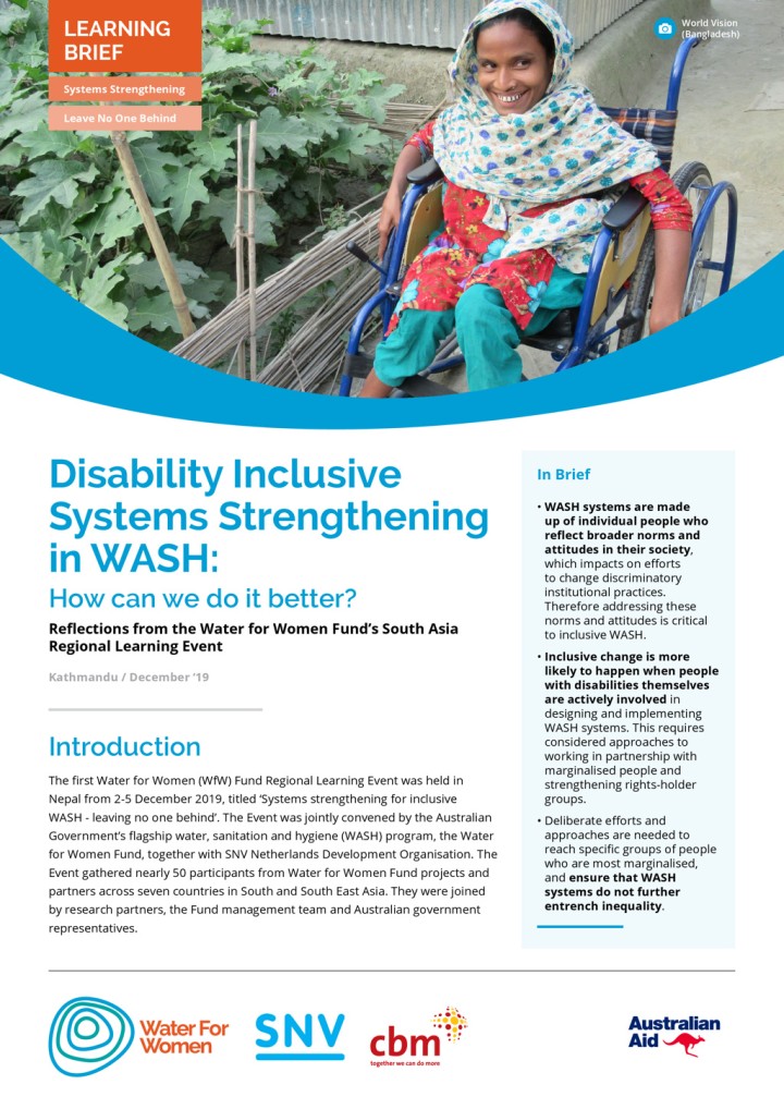 The growing commitment to disability inclusive WASH within the sector has seen much progress in terms of accessible WASH infrastructure at all levels and support for people with disability to manage their WASH needs within their households and communities. The WASH sector is also increasingly focused on the broader enabling environment for WASH policy and practice, or on strengthening ‘WASH systems’. The linkage of these […]