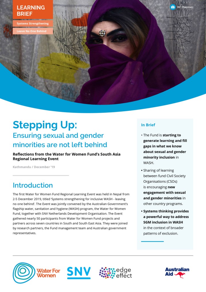 The Water for Women gender and social inclusion (GESI) framework includes sexual and gender minority (SGM) inclusion, alongside inclusion of people with disabilities and more conventional approaches to gender inclusion. This Learning Brief aims to advance the Fund’s collective learning on SGM issues and inclusion by reflecting on the discussions throughout the Systems Strengthening for Inclusive WASH learning event held in December 2019 in Nepal