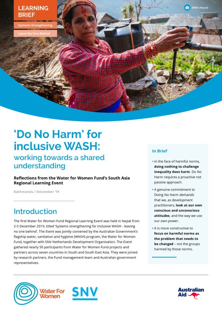 Water for Women sees an intentional focus on ‘Do No Harm’ (DNH) approaches as a critical way of supporting an ethical approach to inclusion. This includes addressing the risk of backlash that comes with supporting representation and decision-making of women and marginalised groups to ensure that no one is left behind in WASH programming. The Fund aims to sharpen collective understanding and practice of DNH […]