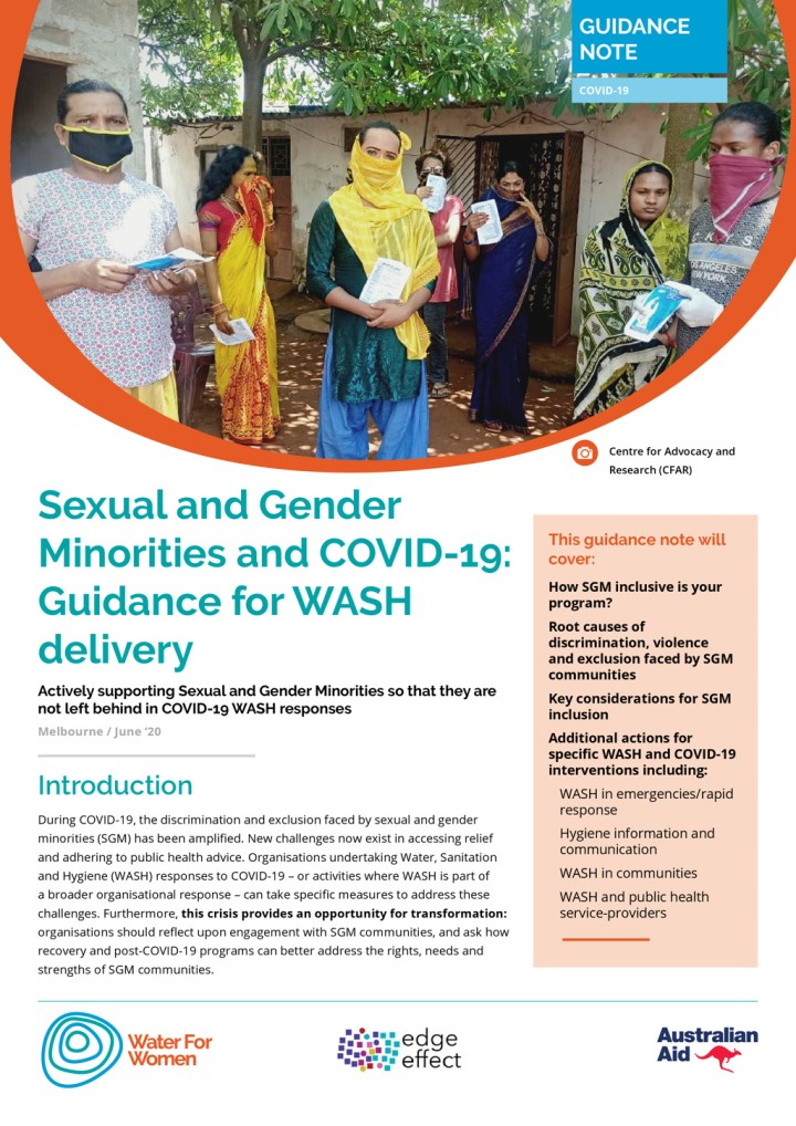 Developed by Water for Women and Edge Effect to provide some key principles, considerations and actions which Water for Women Fund partners, and the Water, Sanitation and Hygiene (WASH) sector more broadly, can apply to strengthen sexual and gender minority inclusion in their COVID-19 and post-COVID-19 programming responses and adaptations.