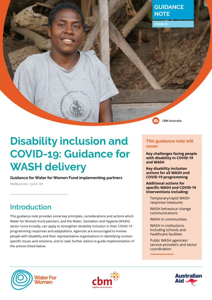 Around 15% of the world’s population has a disability. People with disability are at increased risk of contracting COVID-19 and are more likely to be disproportionately affected by the health, economic and social impacts of the global health pandemic. Developed by Water for Women and CBM Australia to provide some key principles, considerations and actions which Water for Women Fund partners, and the WASH sector […]