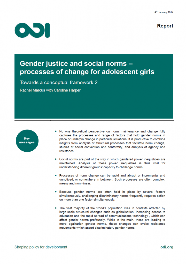 This publication presents the analytical framework for the current phase (year 2) of the Overseas Development Institute (ODI) DFID-funded multi-year policy research programme, ‘Transforming the lives of adolescent girls’, which explores gender justice for adolescent girls in Ethiopia, Nepal, Uganda and Viet Nam. The current phase of this programme explores the changes and continuity in norms related to education and early marriage, along with a […]