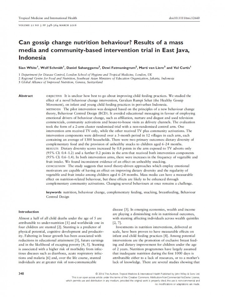 Objective: It is unclear how best to go about improving child feeding practices. We studied the effect of a novel behaviour change intervention, Gerakan Rumpi Sehat (the Healthy Gossip Movement), on infant and young child feeding practices in peri-urban Indonesia. Methods: The pilot intervention was designed based on the principles of a new behaviour change theory, Behaviour Centred Design (BCD). It avoided educational messaging in […]