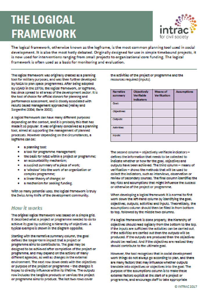 The logical framework, otherwise known as the logframe, is the most common planning tool used in social development. It is also the most hotly debated. Originally designed for use in simple timebound projects, it is now used for interventions ranging from small projects to organisational core funding. The logical framework is often used as a basis for monitoring and evaluation.