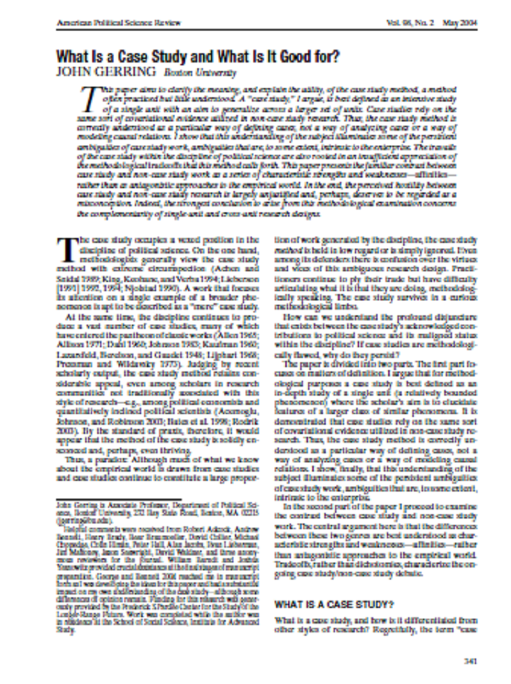 This paper aims to clarify the meaning, and explain the utility, of the case study method, a method often practiced but little understood. A “case study,” I argue, is best defined as an intensive study of a single unit with an aim to generalize across a larger set of units. Case studies rely on the same sort of covariational evidence utilized in non-case study research. […]