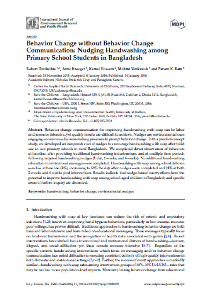 Behavior change communication for improving handwashing with soap can be labor and resource intensive, yet quality results are difficult to achieve. Nudges are environmental cues engaging unconscious decision-making processes to prompt behavior change. In this proof-of-concept study, we developed an inexpensive set of nudges to encourage handwashing with soap after toilet use in two primary schools in rural Bangladesh. We completed direct observation of behaviors […]