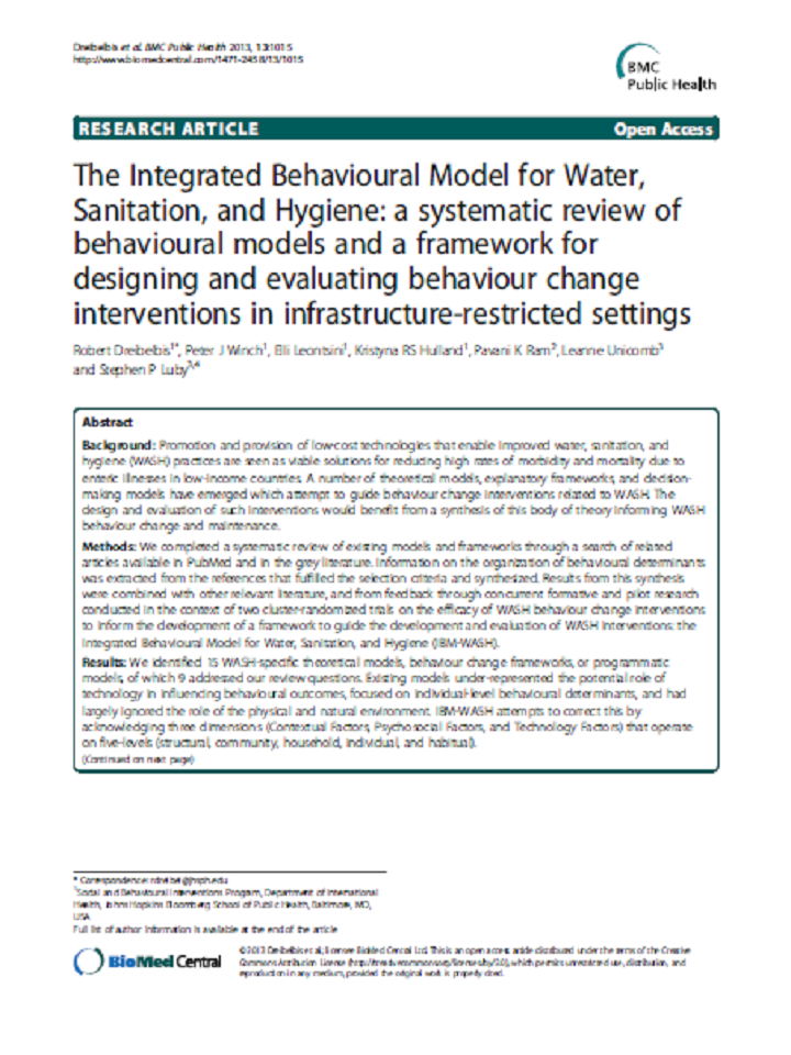 A number of WASH-specific models and frameworks exist, yet with some limitations. The IBM-WASH model aims to provide both a conceptual and practical tool for improving our understanding and evaluation of the multi-level multi-dimensional factors that influence water, sanitation, and hygiene practices in infrastructure-constrained settings. We outline future applications of our proposed model as well as future research priorities needed to advance our understanding of […]