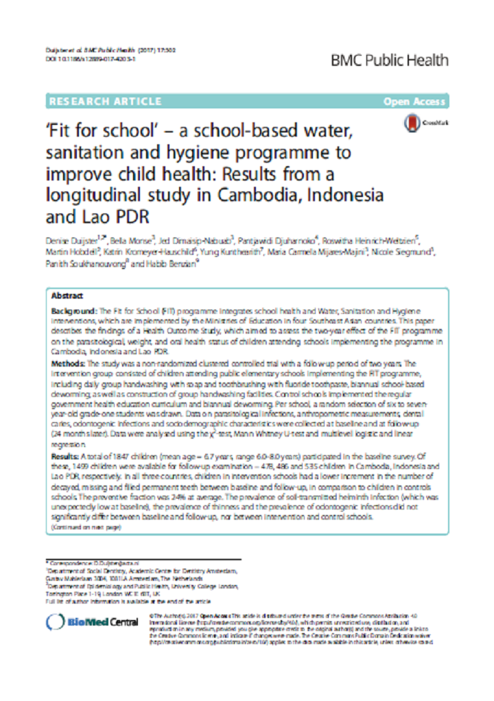 The Fit for School (FIT) programme integrates school health and Water, Sanitation and Hygiene interventions, which are implemented by the Ministries of Education in four Southeast Asian countries. This paper describes the findings of a Health Outcome Study, which aimed to assess the two-year effect of the FIT programme on the parasitological, weight, and oral health status of children attending schools implementing the programme in […]
