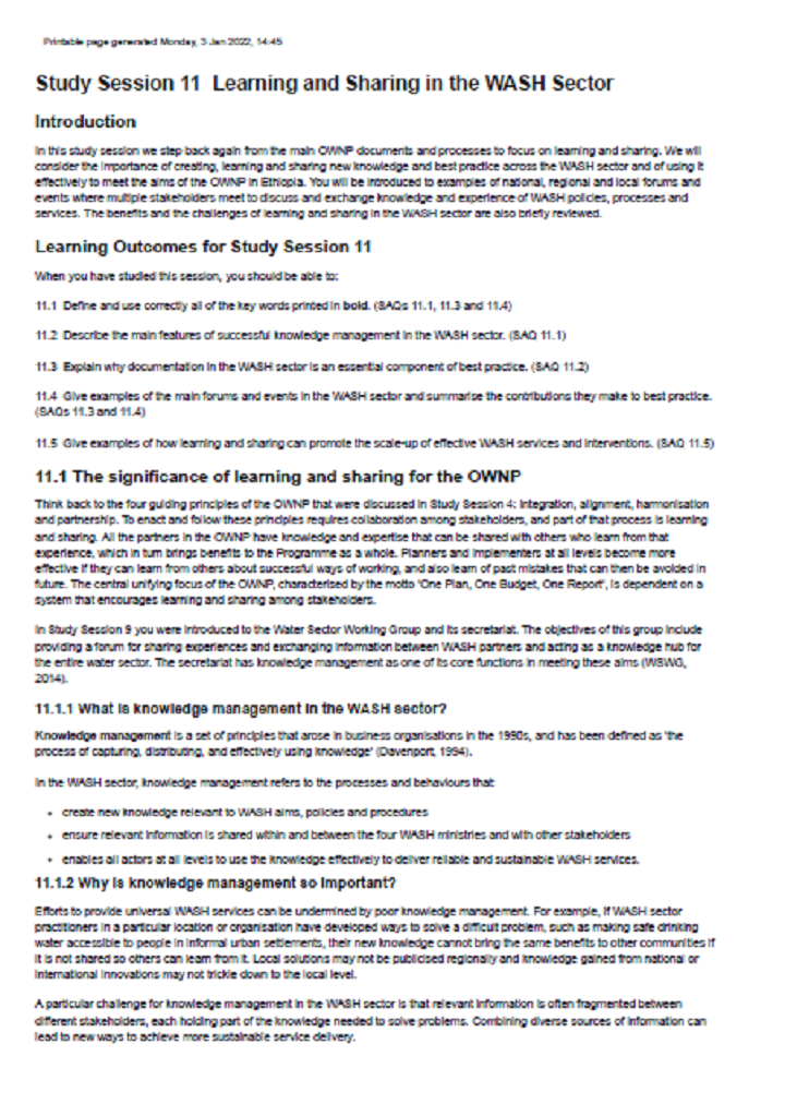 In this study session we step back again from the main OWNP documents and processes to focus on learning and sharing. We will consider the importance of creating, learning and sharing new knowledge and best practice across the WASH sector and of using it effectively to meet the aims of the OWNP in Ethiopia. You will be introduced to examples of national, regional and local […]