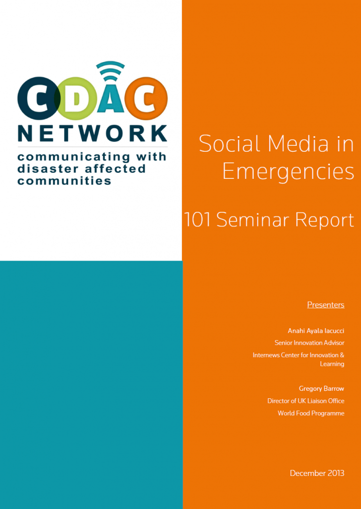 101 Seminar Report: Social Media in Emergencies: On November 25th 2013 the CDAC Network hosted a 101 Seminar on Social Media for Emergencies. The Seminar was led by Anahi Ayala Iacucci of Internews and Gregory Barrow of WFP, and it was hosted by Plan UK. The CDAC Network 101 Seminar Series is designed to build the capacity of members by improving information sharing amongst members […]