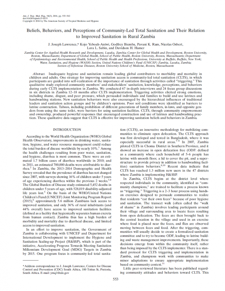 Inadequate hygiene and sanitation remain leading global contributors to morbidity and mortality in children and adults. One strategy for improving sanitation access is community-led total sanitation (CLTS), in which participants are guided into self-realization of the importance of sanitation through activities called “triggering.” This qualitative study explored community members' and stakeholders' sanitation, knowledge, perceptions, and behaviors during early CLTS implementation in Zambia. We conducted 67 […]